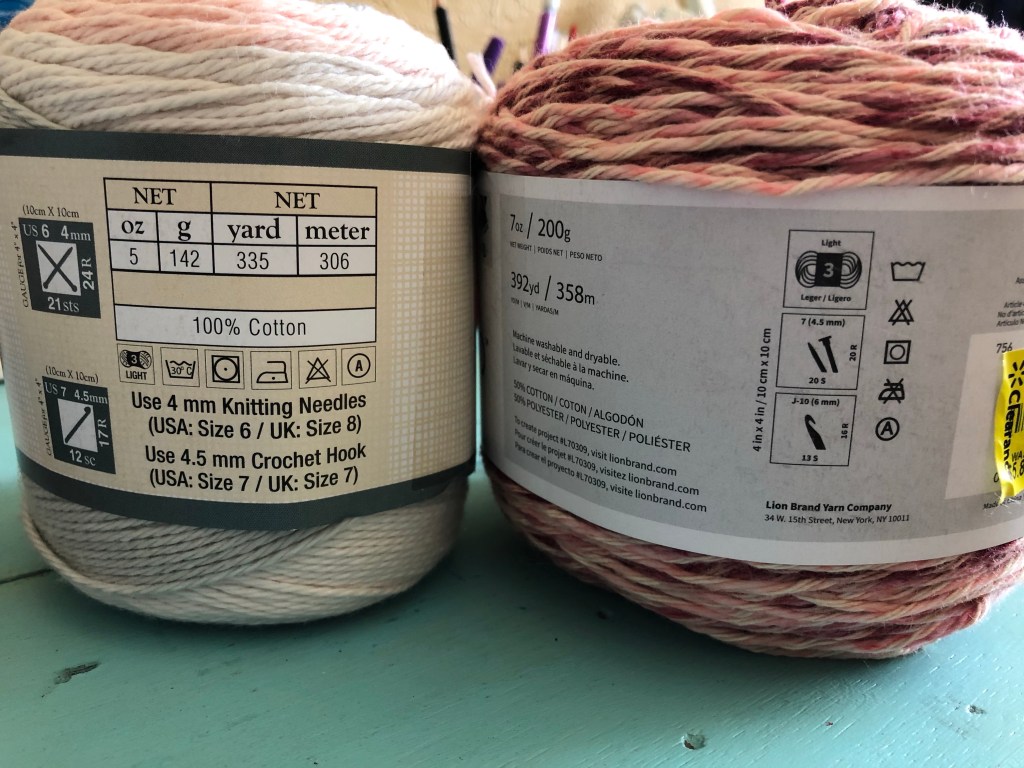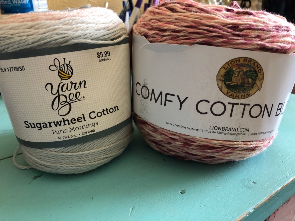 It is called Enjoy Summer Top by Katerina Crochet. I am so excited to be making this top! It requires fingerling yarn, but I have two sports weight cotton which I love! I looked through my stash and am torn between two yarns I have. I have Lion Brand Comfy Cotton Blend color Lovey Dovey and also Sugarwheel Cotton by Yarn Bee in Paris Mornings. I love pink, so both of these would work out!