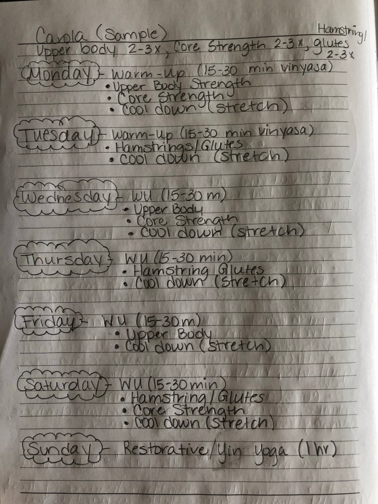On top of taking my YTT, I’ve also been working on an initial workout plan. I did a lot of research on the internet to figure out different ways to put a plan together that fits me. I first thought of my goal/target areas (to help me with yoga). For me they are: