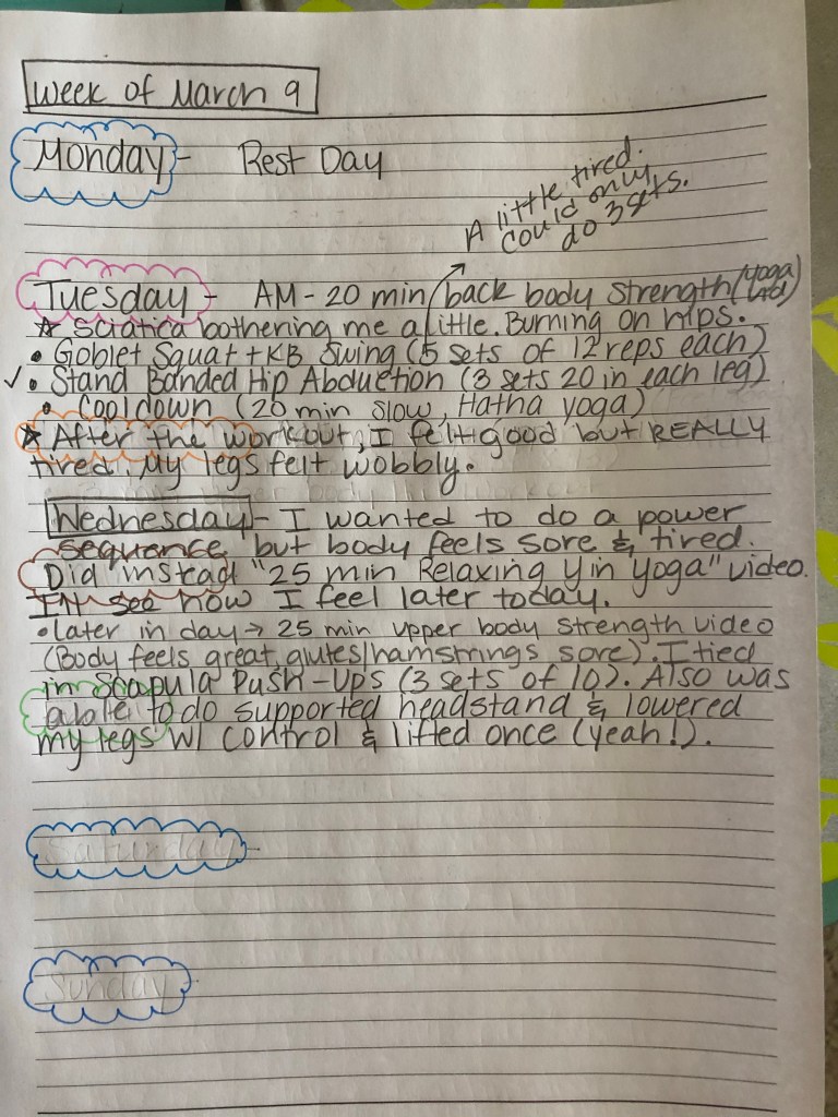 Last thing, everywhere I read, the instructors talked about how they keep a journal and each day write what they did and how they felt before and after the workout. I found a cute planner that I liked. It has the weeks and space to write the workouts. For now, I am just using a journaling notebook my friend gave me as a Christmas present. Here is a picture of this week so far: