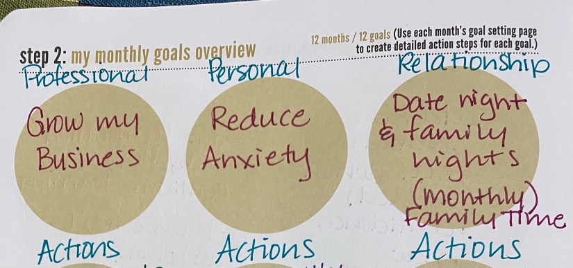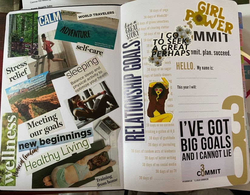 When doing my goals, I come up with 3 big ones: a Professional, Personal, and Relationship goal. I first start with a vision board. Some people like doing them, and some don’t, so do what comes natural to you. I love going through magazines looking for words and images that speak to me. I saw that they also sell on Amazon books specific for this (like this one), but I haven’t used them yet. Once I find the pictures I like, I glue them into the beginning of my planner. I also added some motivational stickers that I had. I try to make it unique to me and in such a way that every time I look at it, I get motivated to achieve my goals.
