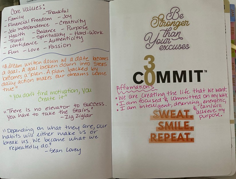 On the next page, I also added my core values, some motivational quotes, MORE stickers, and affirmations. Again, this is just more motivation for me. When I feel down, I look at these pages and it gets me pumped up again.